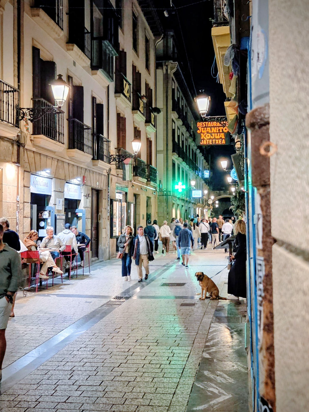 Wir wollen Essen gehen. Pintxos. Typisch San Sebastianisch. Wie Tapas nur aufwendiger. Es gibt viele süße kleine Restaurants. Mit Alfred brauchen wir einen Platz draußen. Die gibts. aber spärlich. So laufen wir vor und zurück. Von Gasse zu Gasse. Alles voll. Oder wir zu langsam. Oder sieht nicht schön genug aus. 😄